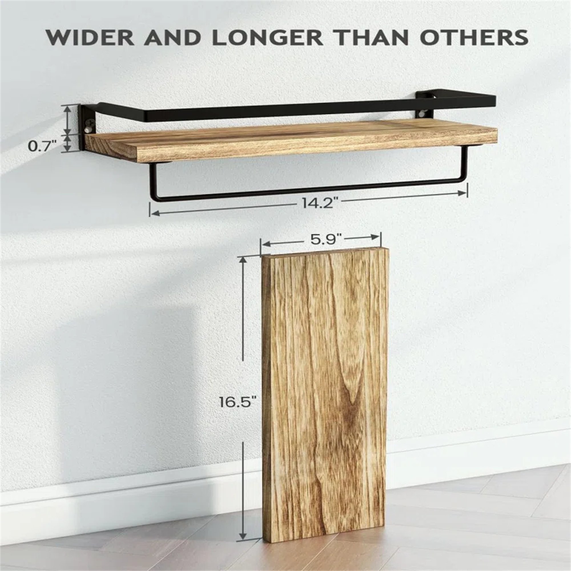 Crafted with Paulownia wood, powder-coated metal bracket, and torched finish, the floating shelves are sturdy and strong enough for holding 40lbs of items. Decor and organized your home more beautifully and neatly. Step 1, unfold the bracket; step 2, install the board and the towel bar; step 3, affix the bracket on the wall. Applicable wall: Wood Stud, Drywall, Concrete Wall.